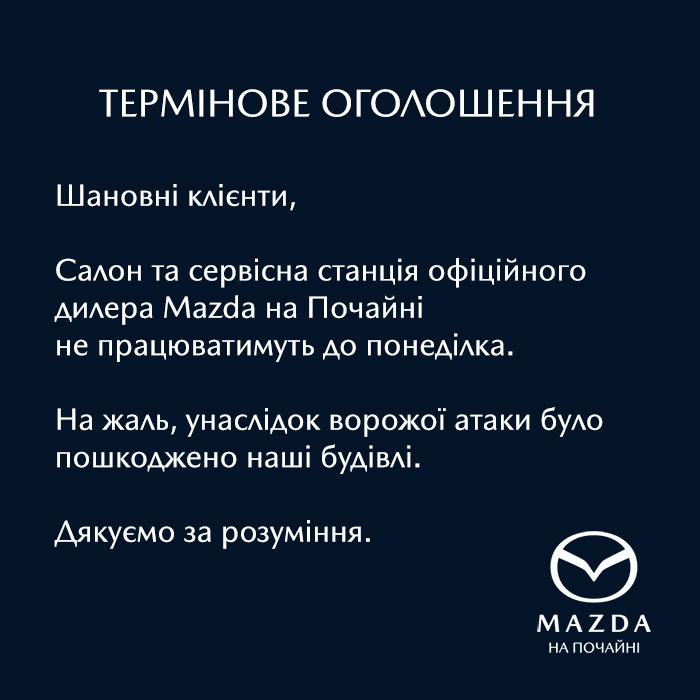 Салон та сервісна станція офіційного дилера Mazda на Почайні не працюватимуть до понеділка.